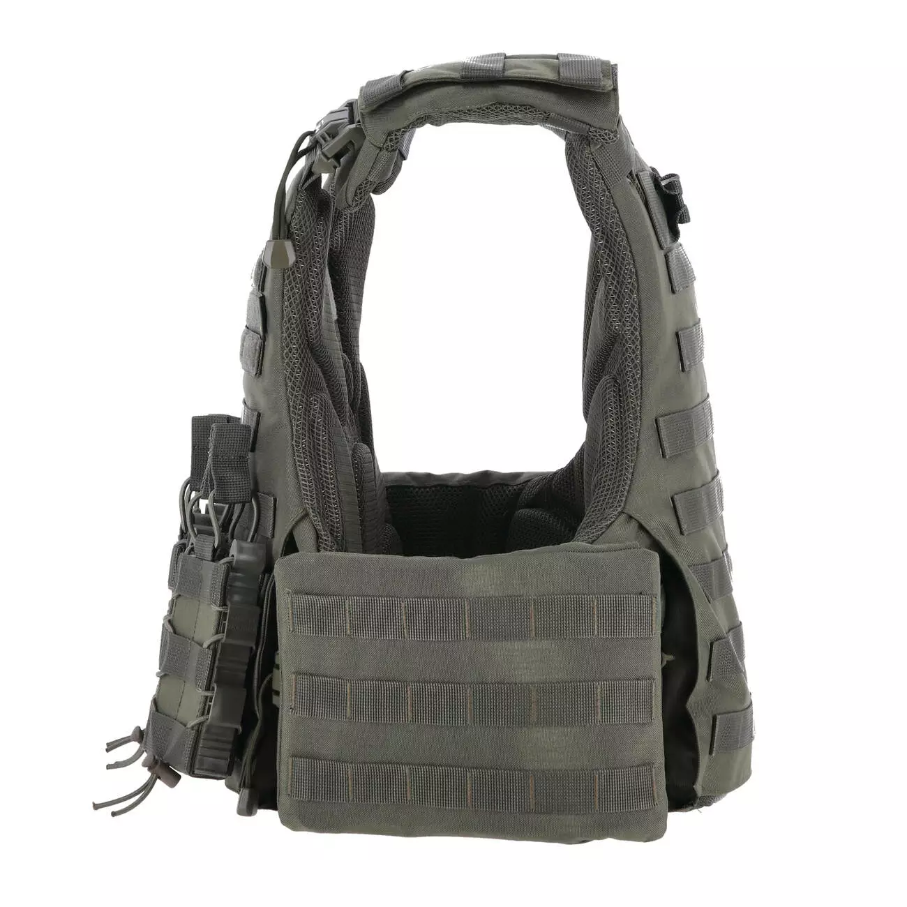 Впереди чехол бронежилета оснащен увеличенной Molle-панелью в пять строп по высоте и имеет ширину в 8 ячеек, что позволяет разместить сразу четыре итога под один или два магазина. Усиленная панель с прорезями в верхней части позволит разместить не только ваши любимые патчи, но и Molle-совместимое снаряжение, например административный итог или крепление для телефона.