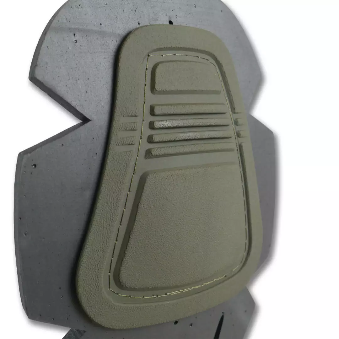 Пришивные накладки наколенников изготовлены из материала ТЭП, которые по сравнению с обычными пластиковыми имеют более гибкую и мягкую фактуру. Это специальные накладки для надежной защиты колен, которые вшиваются в униформу. Внутренняя часть нейлонового наколенника полностью монолитна, что обеспечивает комфорт и отсутствие неудобств при использовании, даже при минимальной толщине подклада. Накладка на колено имеет рифленую структуру, которая предотвращает скольжение по разным поверхностям. Наружная сторона является матовой.