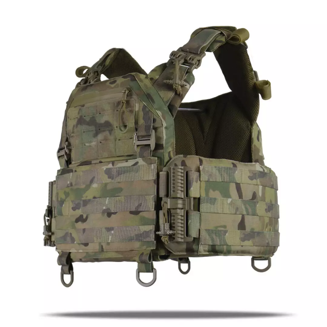 Плитоноска оснащена съемной передней Molle панелью, которая крепится к основанию на Velcro и дополнительно двумя карабинами Woojin. На ней удобно размещаются 3 подсумка под один или два магазина, или другое Molle-совместимое снаряжение. Эту панель можно быстро заменить другой с закрепленным на нее заранее набором нужных подсумков.