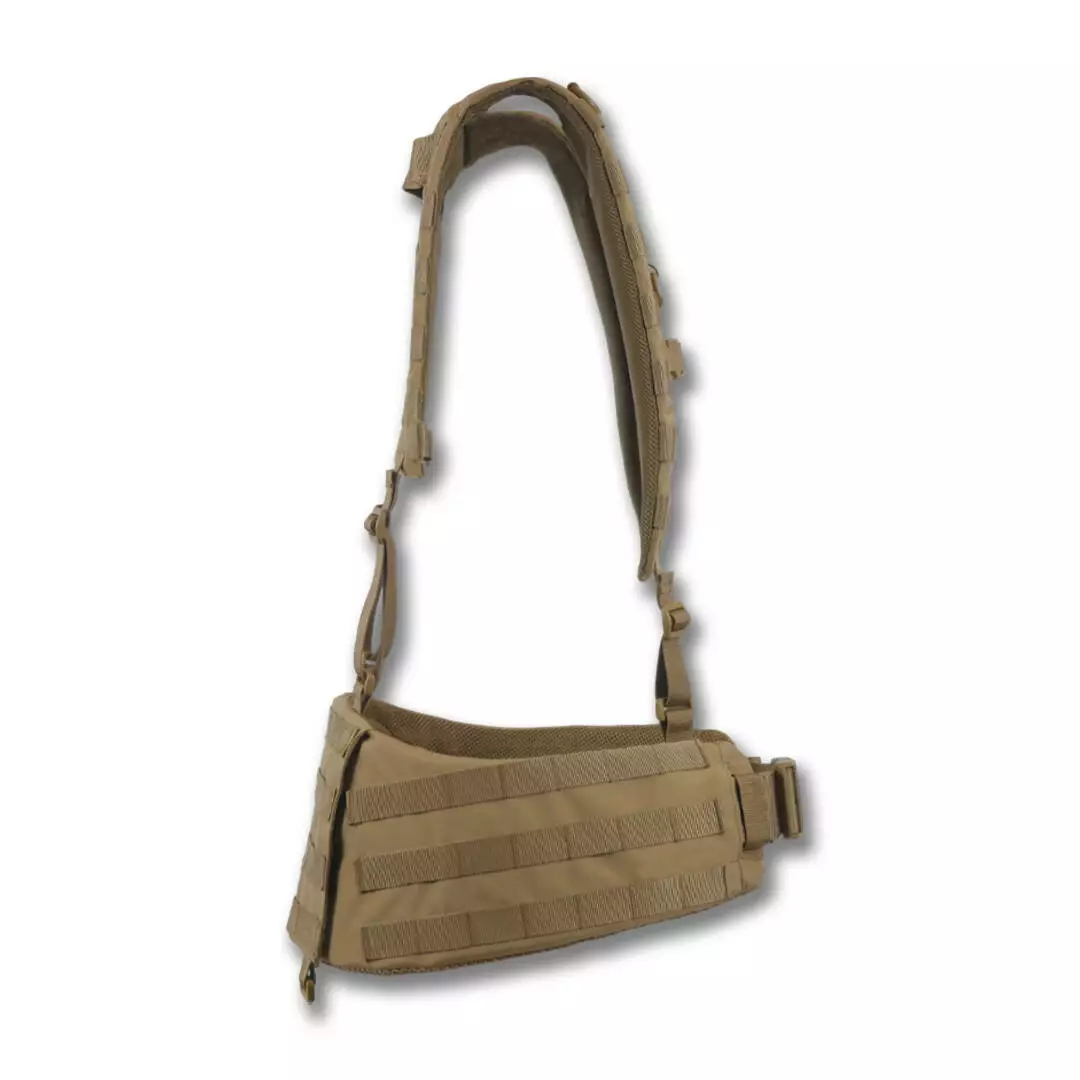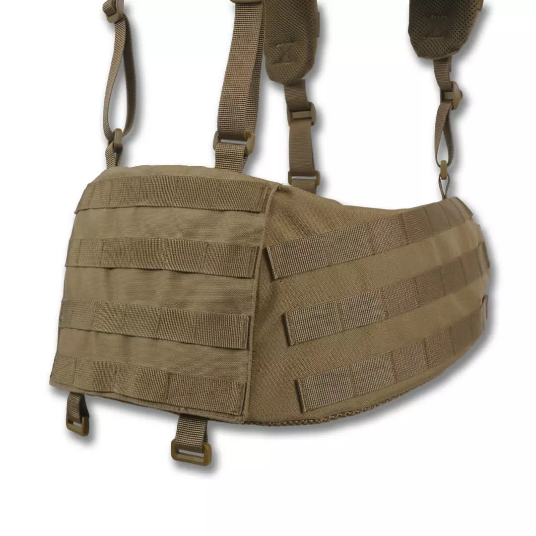 На боковых частях 2 ряда системы molle для крепления итогов или дополнительного снаряжения. Задняя часть увеличена и выполнена с 4-мя рядами molle, что позволяет максимально снарядить пояс необходимым снаряжением. Регулировка пояса происходит в 2 стороны благодаря специальному двухщелевому фастексу WJ и скрытым двухщелям в самом поясе.